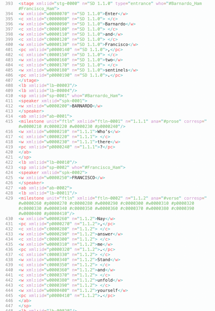 15) 폴저 셰익스피어 도서관의 XML 텍스트는 다음 웹페이지에서 다운로드할 수 있다. https://www.folgerdigitaltexts.org/download/xml.html. XML 파일은 Sublime Text, Oxygen XML 등의 소프트웨어로 열람 및 수정할 수 있다.