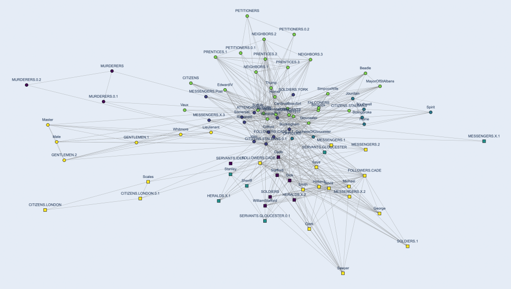 예를 들어 [그림11]에서 『헨리 6세 2부』의 관계망을 살펴보면 주인공에 해당하는 헨리 6세는 관계망의 중앙에 위치했을 뿐만 아니라 헨리 6세를 둘러싸고 있는 다른 주요 인물과 같이 모두 하나의 집단으로 식별되고 주변인물 집단은 각 집단이 등장하는 장에 따라 대체로 따로 식별되는 것을 볼 수 있다. 이는 중세 도덕극의 형태가 1560년대 프레스턴(Thomas Preston)의 『캄비세스』(Cambises)를 거쳐 1590년에 출판된 말로의 『탬벌레인 1부』(Tamburlaine 1)로 전승되는 과정에서 극의 통일성을 확보하기 위해 순차적으로 등장하는 주변집단과 다르게 몇몇 주요 인물 집단이 작품 전체에 걸쳐 유지되었다고 하는 베빙턴의 분석과 맞닿는다.31) 이러한 점에서 『헨리 6세 2부』의 관계망은 『탬벌레인 1부』의 연속선상에서 중세 “영혼의 전쟁” 극의 서사구조가 조금 더 직접적인 형태로 흔적을 남기고 있는 반면, 『햄릿』은 작품의 내용만큼이나 관계망으로 드러나는 서사구조에서 예외적 위치를 차지하고 있다고 볼 수 있다.
