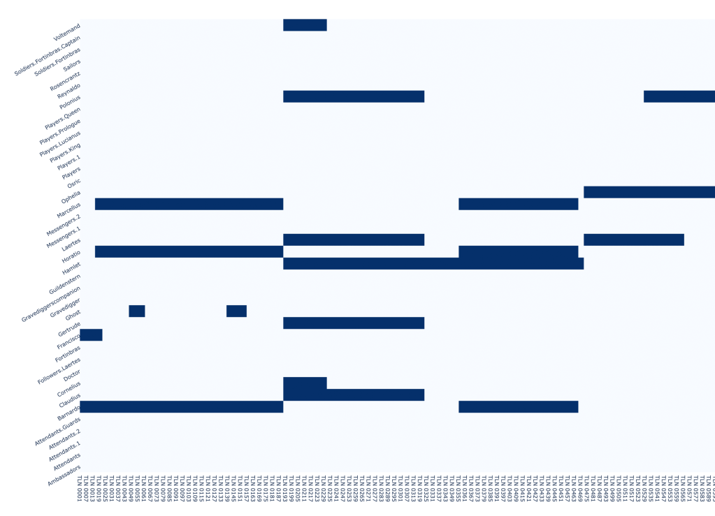 0과 1의 조합으로 등장인물의 무대 동시성을 행렬로 제시하는 [표1]에 대한 시각화는 등장인물의 무대 동시성에 대한 직관적 이해를 돕는다. [그림3]은 『햄릿』의 등장인물 무대 동시성을 시각화한 것의 일부로서 1막 1장부터 3장에 이르는 1행부터 472행까지의 서사 시간 동안 햄릿을 제외하고는 1막 1장과 3장에 등장하는 버나도, 프란시스코, 마셀러스(Marcellus), 호레이쇼(Horatio), 유령(Ghost)으로 이루어진 일군의 등장인물과 1막 2장에 등장하는 폴로니어스(Polonius), 레어티즈(Laertes), 거트루드(Gertrude), 클로디어스, 코닐리어스(Cornelius)로 이루어진 집단이 완전히 분리되어 순차적으로 교차하는 것을 시각적으로 확인할 수 있다. 부분적인 예시에 불과하지만, 『햄릿』 1막의 이러한 등장인물 군집 형태는 도런이 지적한 중세 서사의 “순차적 사건” 전개의 형태를 17세기 전환기 셰익스피어 극에서도 확인할 수 있는 것으로 볼 수 있다. 또한 이러한 분리된 군집 형태는 여러 배역을 한 배우가 소화할 수 있는 형태로 구조화된 퀸스멘(Queen’s Men)과 같은 유랑극단의 서사구조가 역병의 시기를 제외하고는 런던에 상주했던 셰익스피어의 극단에도 부분적으로 이분된 등장인물 군집 형태로 남아 있는 것으로 해석할 수 있다.18)