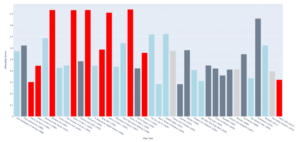 셰익스피어 극 38편에 대한 [그림3]과 같은 시각화는 개별 작품이 각 행의 단위에서 어떻게 등장인물이 군집하는지 직관적인 자료를 부분적으로 제공하지만, 작품 전체의 군집성을 파악하고 한 작품과 다른 작품을 군집성 중심으로 비교하는 데는 한계를 지닌다. K-평균 군집화(K-means clustering)는 주어진 K 군집의 숫자에 따라 모든 데이터 포인트를 가장 적절하게 분할하는 알고리즘으로, K값을 2로 하여 두 개의 집단으로 극의 모든 등장인물을 최적으로 분할하는 방법을 찾는 데 활용되었다.19) K-평균 군집화를 통해 분석된 등장인물 관계망이 주어진 K개의 집단에 얼마나 정확히 들어맞는지는 실루엣 점수(silhouette score)를 통해 측정할 수 있다.20) 이 연구에서 실루엣 점수는 한 명의 등장인물이 가장 가까운 다른 집단에 속한 등장인물들과의 평균거리와 같은 집단 내 다른 등장인물들과의 평균거리를 기반으로 측정한다.21) 실루엣 점수는 -1.00부터 1.00 사이의 값을 지니는데, 1.00은 주어진 K개의 집단으로 관계망이 완전히 구분되는 것을, 0.00에 근접한 값은 집단 구분의 경계선에 근접하게 위치하는 것을, -1.00에 근접한 값은 잘못된 집단에 속한 것을 의미한다. [그림4]는 셰익스피어 작품 38편에 대해 K값을 2로 지정할 때, 즉 등장인물의 관계망을 두 집단으로 나눌 때 얼마나 잘 구분될 수 있는지를 실루엣 점수를 기반으로 보여주는 것이다. 이는 르네상스 희곡에 남아 있는 중세 희곡의 이분적 구조라는 베빙턴의 가설을 계량적 연구방법으로 살펴보려는 시도다. [그림4]에서 38편의 작품은 작성 연도를 기준으로 나열되어 있으며, 막대그래프의 색은 희극(하늘색), 비극(회색), 역사극(빨간색)이라는 세 개의 장르를 나타낸다.22) [그림4]는 실루엣 점수와 작품의 작성 연도 사이에 유의미한 상관관계가 없음을 보여준다. 즉 셰익스피어 초기극이 후기극보다 더 이분적 구조를 지니지 않는다.