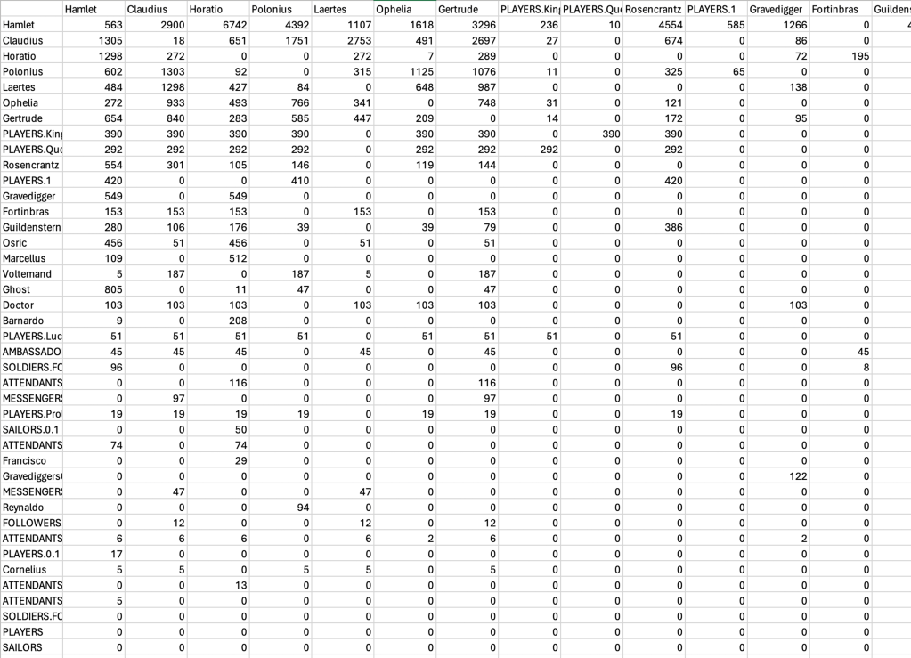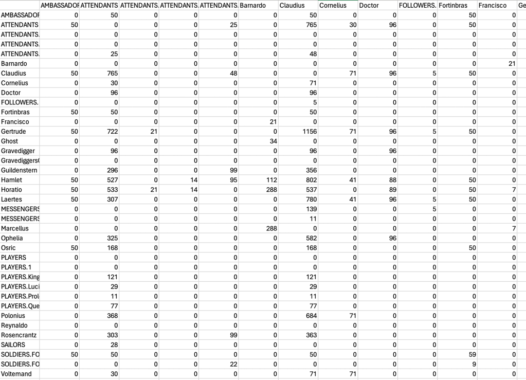 관계망 구축에 사용된 첫 번째 구성 요소인 무대 동시성에 기반한 [표2]와 다르게, [표3]은 두 번째 구성 요소인 등장인물 사이의 대화량을 기반으로 한다. 두 등장인물 사이의 대화는 먼저 한 등장인물의 대사에 포함된 단어 수의 총합을 구한 후, 이 대사가 이루어진 시점에 무대 위에 존재하는 다른 모든 등장인물을 청자로 설정하고 수치화한다. 『햄릿』 1행을 예로 들면, 버나도가 “Who’s there?”라고 말하는 시점에 무대에는 프란시스코가 같이 있다. 따라서 1행의 두 단어에 대해 버나도와 프란시스코는 2라는 수치를 획득한다. 이어지는 2행에서 프란시스코는 7개 단어로 이루어진 대사를 하고 이에 대해 버나도가 청자로 설정되어 두 등장인물 사이의 관계는 2행까지 9라는 수치를 지니게 된다. [표3]의 행렬에서 버나도와 프란시스코는 최종적으로 52라는 수치를 가지는데, 이는 버나도와 프란시스코가 작품 전체에서 총 52개 단어의 대화를 주고받았음을 의미한다. 이와 같은 방법으로 화자로 설정된 모든 등장인물의 대사에 대해 청자로 설정된 등장인물 사이의 관계를 대사의 단어 총수로 수치화한 것이 대화량에 기반한 행렬이며, 이러한 방식으로 셰익스피어의 작품 38편에 대해 프로그래밍을 통해 38개의 표를 만들었다.