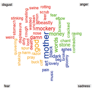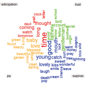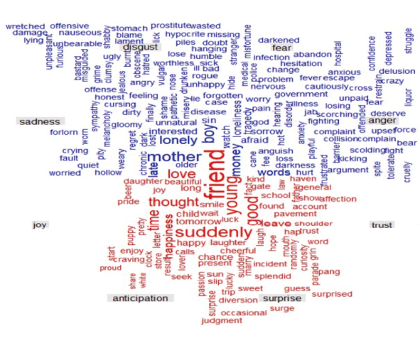수제 패키지에 포함된 NRC(National Research Council Canada) 사전은 소설의 특정 섹션에서 어떤 종류의 감정이 상대적으로 높은 빈도로 나타나는지 파악하는 데 유용하다. 모하메드(Saif Mohammad)가 개발한 이 사전은 긍정적인 감정과 부정적인 감정이라는 구분 이외에도 각 단어를 화(anger), 기대(anticipation), 혐오(disgust), 불안(fear), 기쁨(joy), 슬픔(sadness), 놀라움(surprise), 신뢰(trust)라는 여덟 가지 감정값으로 분류해놓았다. 본 연구에서는 NRC 사전을 이용해 이 여덟 가지 감정이 분석 대상 텍스트에서 어떤 빈도로, 어떤 단어에서 주로 나타나는지를 워드클라우드로 시각화하고 특정 감정으로 분류되는 문장 목록도 추출하여 텍스트 분석에 활용했다.