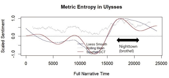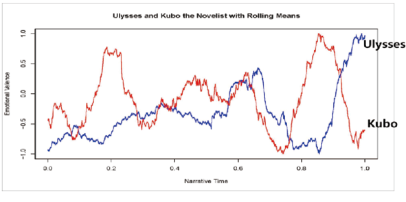 x축의 값은 문장 단위로 측정한 소설의 전체 서사 시간이며, y축의 값은 -1(부정), 0(중립), 1(긍정) 범위의 척도를 기준으로 보정된 감정점수를 나타낸다. 그 결과 1장의 저점인 마르텔로 요새탑에서 시작하여 → 5장의 더운 여름날의 거리(상승) → 6장의 공동묘지(하강) → 9장의 아일랜드 국립도서관(상승) → 11장의 오먼드 호텔(하강) → 12장의 술집(상승) 및 13장의 해변 바위(상승) → 15장의 사창가(하강) → 17장의 집(상승)이라는 감정곡선의 변화를 보인다.