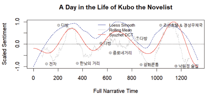 『소설가 구보씨의 일일』은 구보가 점심때쯤 집을 나와 경성을 산책하다가 새벽 2시에 다시 집으로 귀가하는 순환적 경로를 따르고 있다. 이 소설은 구보라는 한 인물의 시점을 중심으로 서술되었으며, 상대적으로 변덕스럽고 자의적인 개인의 감정변화가 반영되었기 때문에 『율리시스』와 비교했을 때 감정그래프의 굴곡이 자의적이고 서사의 예측이 어렵다(그림 6). 중간에 한 번의 커다란 추락이 있지만 전반적으로 감정선이 우상향 형태를 유지하는 『율리시스』는 여러 사람의 감정이 서사에 영향을 끼치고 있음에도 일관되게 집단적 정서를 생성하고 있다. 식민도시의 상실감과 그 상실감을 보상하려는 과장된 심리가 다양한 형태의 굴곡으로 나타나는 가운데 마지막에 블룸이 “집”으로 돌아가는 여정의 끝에서 감정값이 최고점을 찍음으로써 일상적인 삶 속 구원의 가능성을 내비친다. 그에 반해 대학교육까지 마쳤으나 마땅한 직장이 없이 거리를 배회하는 구보의 시선을 통해 서술되고 있는 박태원의 소설에서 감정곡선은 구보가 매 순간 마주치는 도시 장면에 대한 즉각적 반응으로 이루어진다. 그는 근대화의 매혹적 풍경을 동경하지만 어떤 순간에는 그 풍경 뒤에 도사리고 있는 식민지 시기의 불안과 우울을 느끼기도 한다. 임의로 상승과 하강을 반복하다 마지막에는 저점과 가까운 곳에서 멈추는 구보의 감정곡선에는 행복이나 불행이라는 감정을 토대로 한 익숙한 이야기 플롯이 부재하다.