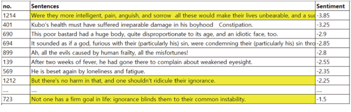 31) [그림 9]는 이 소설에서 가장 부정적인 감정값을 지닌 문장을 내림차순으로 나열한 것으로, 하이라이트된 문장은 도시인의 무지를 지적하는 부분이다. 그 밖에도 가장 부정적인 감정값을 지닌 문장들을 살펴보면 대부분 도시인의 질병과 고독을 나타냄을 알 수 있다.